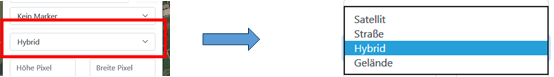 Straßenkarte oder Hybrid) sowie der verwendeten Zoom-Stufe sind. Über den Pfeil gelangen